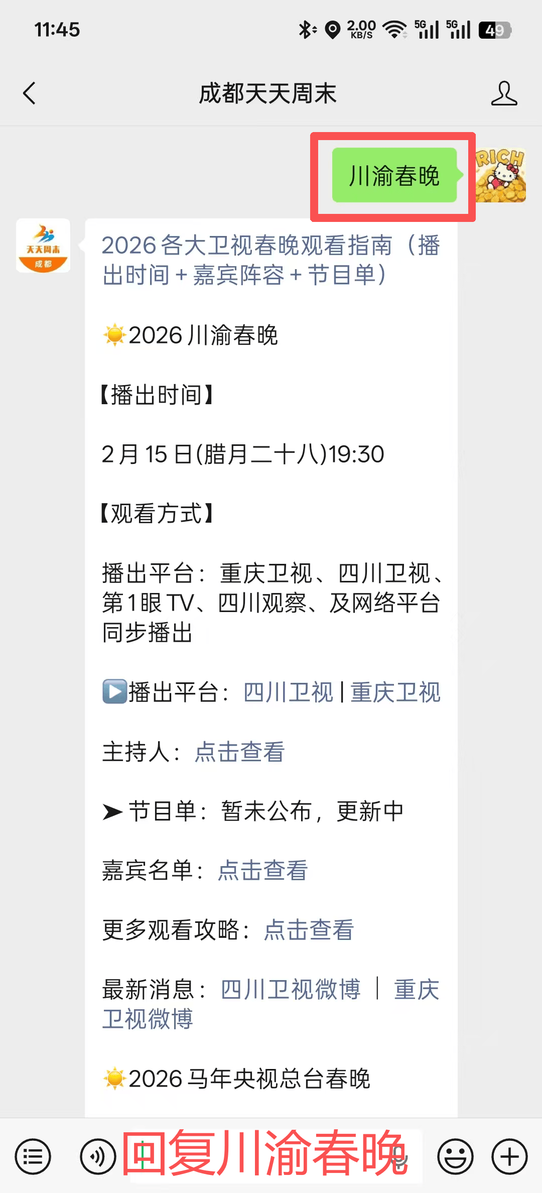 ☞小编提示成都天天周末】号,正在对话框答复环节词【春晚】,✅嘉宾阵容:锤娜丽莎 、程潇 、窦晨曦 、飞扯喜剧 、冯巩、付航、侯林林、颢鑫、李川、李嘉诚、李鸣宇、刘旸、吕严、李治良、毛晓彤、秦海璐、秦艺桐、宋小宝、宋晓峰、土豆、王建华、文松、王小利、徐浩伦、谭湘文、杨迪、YOYO、杨雨光、郑健、朱时茂、张维威、张兴朝等✅嘉宾阵容:李宇春、陈楚生、黄子弘凡、万妮达、余宇涵、岳云鹏、赵雅芝、周深等布瑞吉Bridge、GAI周延、海来阿木、黄小蕾、安崎、陈思思、房主的猫、江映蓉、SNH48﹣杨冰怡、TF家族四代等✅嘉宾阵容:陈楚生、梁咏琪、、曾舜晞、RED女团、薛家燕、威神V、张呈、郭颖、李振宁、卓依婷等